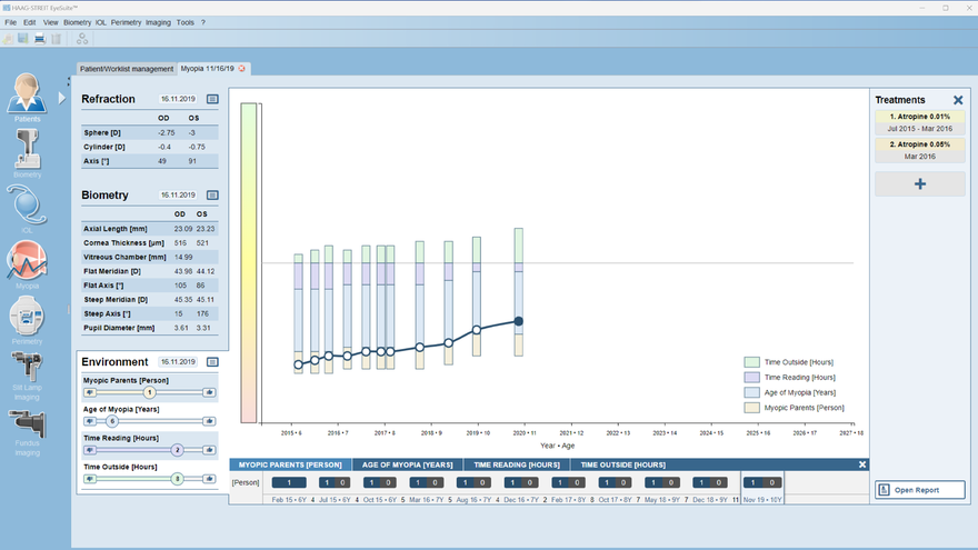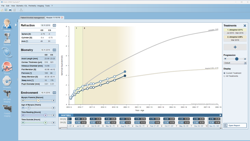 Der Refraktionsbildschirm bietet eine umfassende Visualisierung der Refraktionsfehlerdaten im Zeitverlauf. Im Mittelpunkt steht ein dynamisches Diagramm, das den Verlauf des Refraktionsfehlers verfolgt und es Ärztinnen und Ärzten ermöglicht, Änderungen und Trends genau zu überwachen. Dieses Diagramm bietet unschätzbare Einblicke in die Augengesundheit und kann durch die Überlagerung von Therapiezeiträumen und -typen weiter verbessert werden. Auf diese Weise können Augenspezialistinnen und -spezialisten die Wirksamkeit therapeutischer Interventionen einschätzen und fundierte Entscheidungen über Behandlungspläne treffen. Darüber hinaus liefert dieser Bildschirm ausschliesslich Prognosen zur Entwicklung von Refraktionsfehlern bei Myopiepatientinnen und -patienten.
