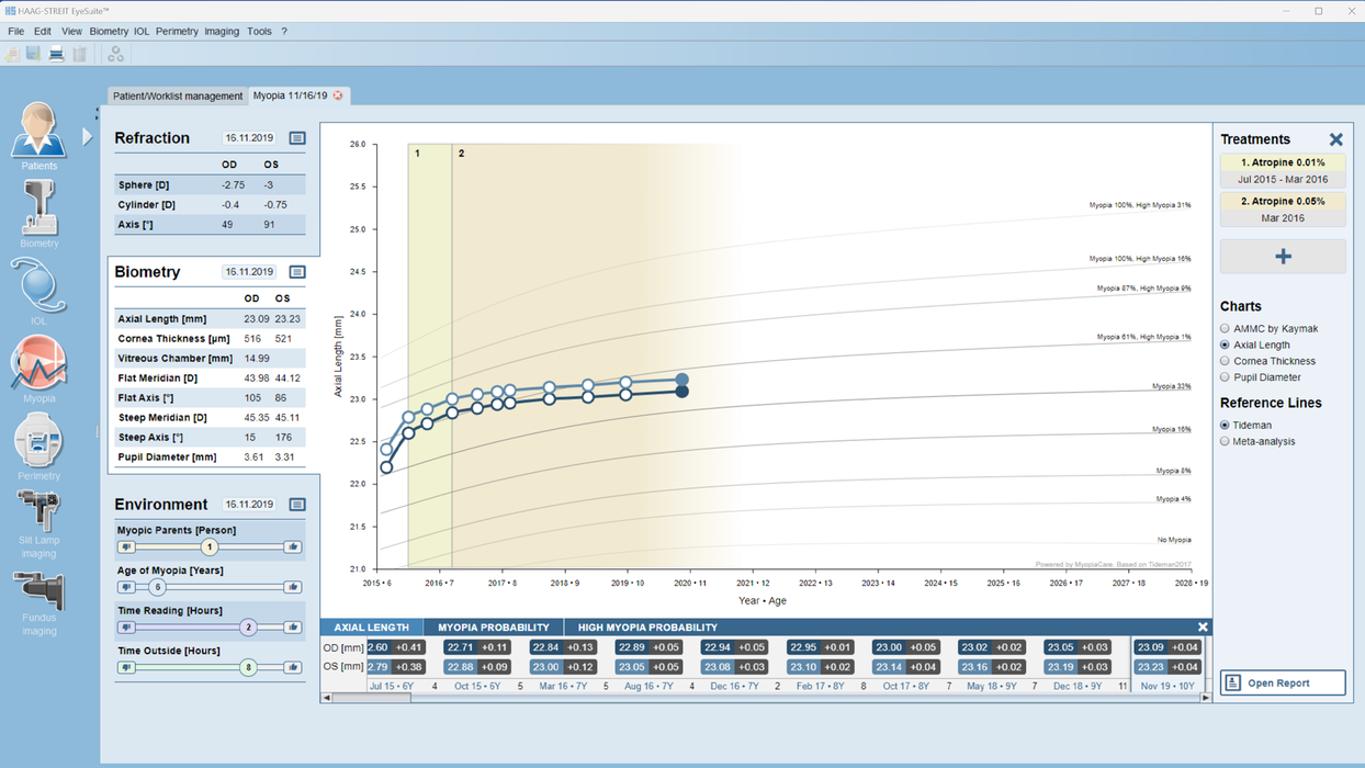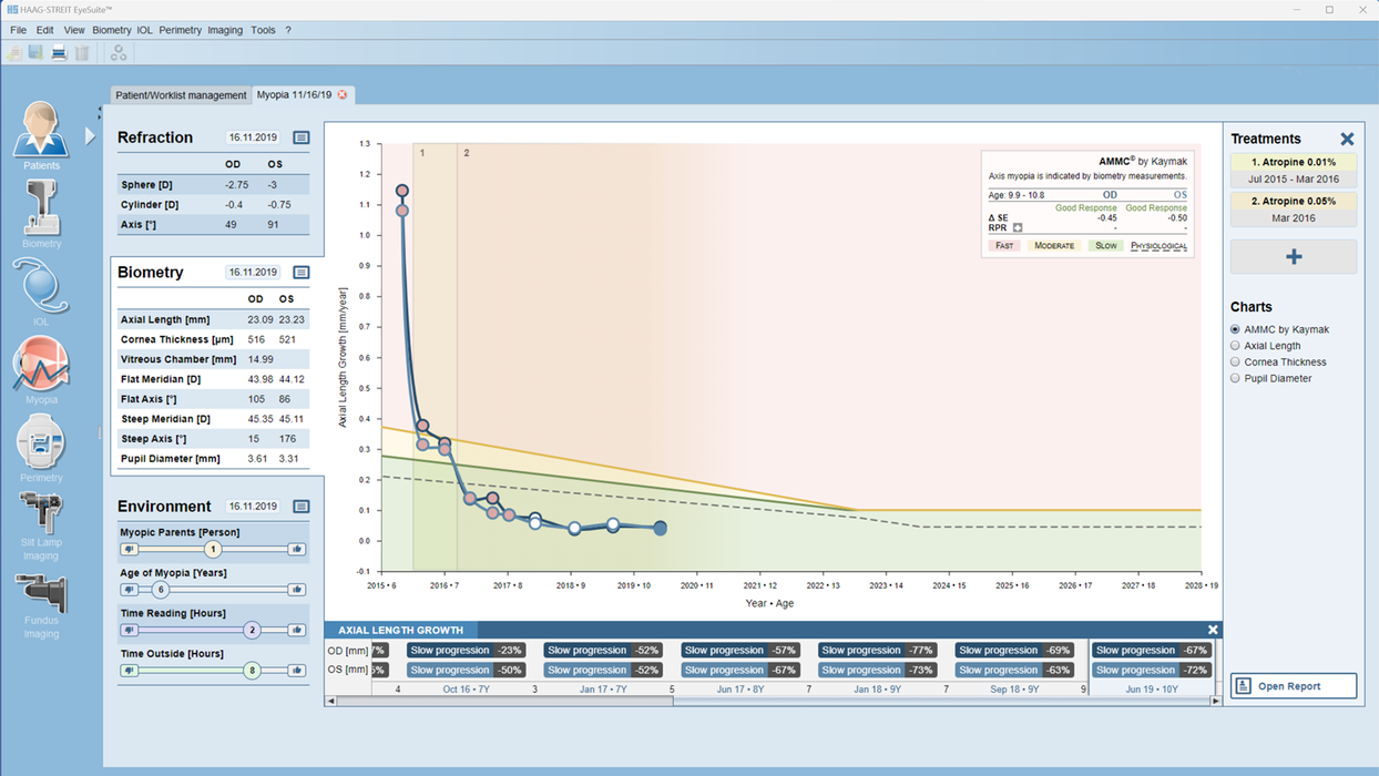 Die altersabhängige Myopiekontrolle klassifiziert das axiale Wachstum schnell anhand von Ampelfarben und überlagert das Diagramm mit Behandlungsperioden und -typen. Zusammen mit einer umfassenden Infobox bietet sie detaillierte Einblicke, z. B. das Ansprechen auf die Behandlung. Sie stellt auch eine numerische Anzeige der Abweichung vom emmetropischen Wachstum zur Verfügung, sodass Fachleute beurteilen können, ob sie auf dem richtigen Weg sind, um das Therapieziel zu erreichen.