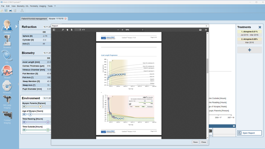 Dieser Bildschirm bietet ein umfassendes Berichtstool, mit dem alle wichtigen Informationen jederzeit verfügbar sind. Das Tool bietet mehr als nur die Anzeige aller Grafiken und Visualisierungen. Es verfügt über eine Fülle an leicht verständlichen Informationen über Behandlungen und positiv wirkende Umgebungsfaktoren, sodass sich Patientinnen und Patienten sowie Eltern weiterbilden können. Die Software ist hochgradig anpassbar und erfüllt die spezifischen Erwartungen jeder Klinik und Praxis, einschliesslich des Corporate Designs und der Patientendemographie. Die Berichte können mühelos über digitale Kanäle oder gedruckte Kopien mit den Eltern geteilt werden, sodass sie wertvolle Informationen über ihre Entdeckungsreise in die Augenheilkunde mit nach Hause nehmen können.